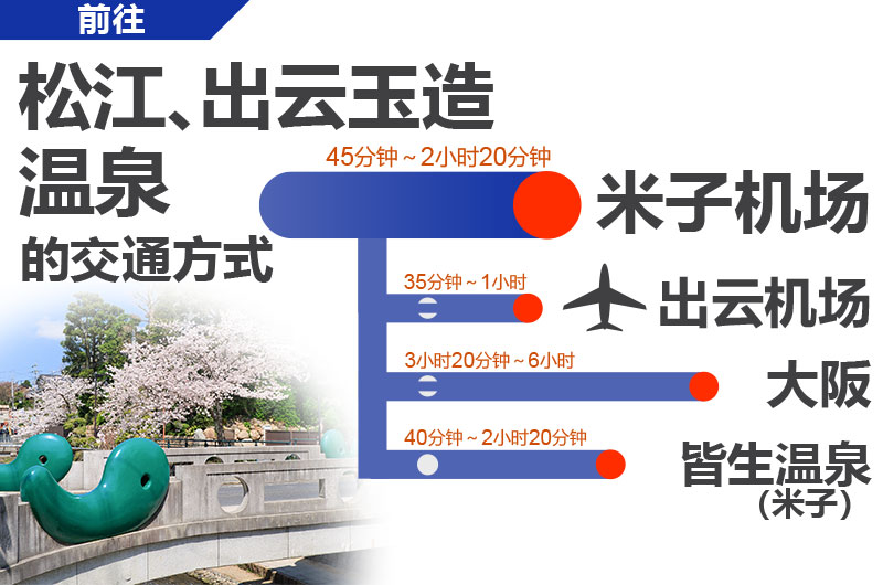 如果从米子机场及出云机场前往松江、出云玉造地区,有直达巴士,如果从大阪,有JR特急列车或高速巴士。如果从皆生温泉(米子)前往松江、出云玉造温泉,有JR在来线及特急列车。