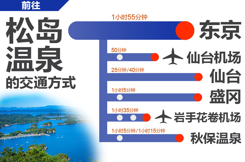 如果从仙台机场前往松岛地区,有铁路及JR在来线运行,如果从东京、仙台、盛冈及岩手花卷机场,有JR新干线及JR在来线运行。如果从秋保温泉前往松岛温泉,有公交车及JR在来线运行…