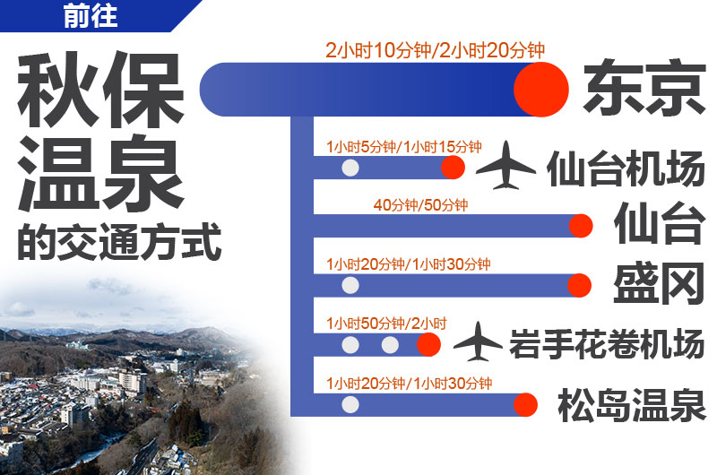 如果从仙台机场前往秋保地区,有铁路及公交车运行,如果从仙台,有公交车运行,如果从东京、盛冈及岩手花卷机场,有JR新干线及公交车运行。如果从松岛温泉前往秋保温泉,有JR在来线及公交车运行…